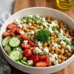 A refreshing and flavorful Mediterranean Chickpea Salad featuring a vibrant mix of chickpeas, crisp cucumber, sweet cherry tomatoes, tangy feta cheese, and a zesty lemon-olive oil dressing. Perfect as a light lunch or a side dish for any meal.