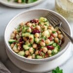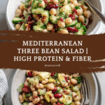 Keywords: Mediterranean bean salad, three bean salad, high protein salad, high fiber salad, no-cook salad, vegetarian salad, healthy Mediterranean recipes