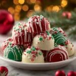 These No-Bake Christmas Cheesecake Bites are festive, creamy, and perfect for holiday gatherings. Made with a smooth cream cheese base, melted white chocolate, and crunchy graham cracker crumbs, they are rolled into bite-sized balls and decorated with colorful red and green candy melts and holiday sprinkles. No oven needed, these delightful treats come together quickly and make a beautiful addition to your Christmas dessert table.