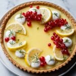 - Garnish and Serve: Before serving, carefully remove the tart from the pan. Garnish the top with lemon slices, fresh red currants, dollops of whipped cream, rosemary sprigs, and edible flowers for an attractive presentation. Serve chilled.