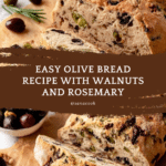 This olive bread is a savory, flavorful loaf packed with a mix of green, black, and Kalamata olives, complemented by fresh rosemary and crunchy walnuts. It’s a moist, tender bread perfect for sandwiches or enjoying with a drizzle of olive oil.