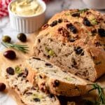 This olive bread is a savory, flavorful loaf packed with a mix of green, black, and Kalamata olives, complemented by fresh rosemary and crunchy walnuts. It’s a moist, tender bread perfect for sandwiches or enjoying with a drizzle of olive oil.