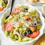 Keywords: Olive Garden salad recipe, Italian salad, homemade Italian dressing, iceberg lettuce salad, pepperoncini salad, copycat restaurant salad