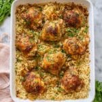 Keywords: oven baked chicken and rice, baked chicken thighs, one-pan chicken and rice, Mediterranean chicken recipe, easy dinner recipe
