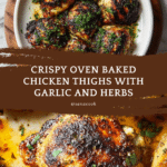 Keywords: oven baked chicken thighs, crispy chicken thighs, baked chicken recipe, easy chicken dinner, chicken with garlic and herbs