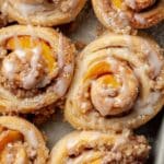 - Finish: Once the rolls are baked and still warm, drizzle the cream cheese frosting generously over them before serving. Enjoy your peach cobbler cinnamon rolls warm for the best experience.