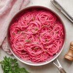 Keywords: Pink pasta, beet pasta, creamy beet sauce, vegetarian pasta, spaghetti with beet sauce, healthy pasta recipe