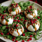 Celebrate the festive season with these stunning Pomegranate & Burrata Christmas Ornaments. Creamy burrata balls are beautifully coated with crunchy pistachios and fresh parsley, crowned with jewel-like pomegranate seeds, and served on a bed of peppery arugula. Finished with a drizzle of sweet balsamic glaze, this elegant appetizer combines contrasting textures and flavors in a visually captivating presentation perfect for holiday gatherings.
