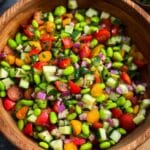 A refreshing and protein-packed edamame salad perfect for a quick 20-minute healthy meal. This vibrant salad combines tender shelled edamame with crisp cucumbers, juicy tomatoes, red bell pepper, and zesty lime dressing seasoned with Himalayan salt, black pepper, and a touch of cayenne for a subtle kick.