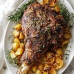 Keywords: Roast leg of lamb, bone-in lamb recipe, roasted potatoes, Mediterranean lamb, garlic rosemary lamb