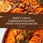 This Roasted Sweet Potatoes with Garlic and Parmesan recipe delivers a flavorful and comforting side dish featuring tender, thinly sliced sweet potatoes coated in a garlicky, buttery Parmesan mixture. Roasted to a perfect golden brown with aromatic herbs like fresh thyme and Italian seasoning, this dish combines savory, cheesy, and slightly sweet notes for a delightful addition to any meal.