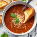 Keywords: Roasted tomato soup, tomato soup recipe, roasted tomatoes, easy tomato soup, homemade tomato soup, basil tomato soup