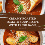 This Roasted Tomato Soup recipe features ripe tomatoes oven-roasted to deepen their flavor, combined with sautéed onions and garlic, fire-roasted canned tomatoes, fresh basil, and herbs for a rich, comforting dish. The soup is pureed to a smooth texture and simmered to meld the flavors perfectly, making it a delicious and hearty meal option.