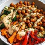 A hearty and flavorful Roasted Vegetable & Chickpea Bowl featuring perfectly roasted bell peppers, zucchini, carrots, and chickpeas seasoned with garlic and paprika. Topped with a creamy, tangy tahini-lemon dressing, this wholesome bowl is a nutritious, vegan-friendly meal that’s easy to prepare and perfect for lunch or dinner.