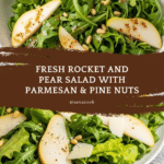 A fresh and vibrant Rocket and Pear Salad featuring peppery arugula, sweet and juicy pears, nutty toasted pine nuts, and shaved parmesan, all brought together with a tangy wholegrain mustard and lemon dressing. This easy-to-make salad is perfect for a light lunch or a sophisticated starter.