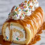 Salted Caramel Birthday Roll Cake is a luscious treat that combines the rich flavors of caramel and vanilla in a light, fluffy sponge. Perfect for celebrations, this cake roll is adorned with creamy caramel whipped cream and festive sprinkles for an irresistible dessert.