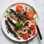 - Assemble the Salad: Arrange the cooked sardines on serving plates. Place the sliced tomatoes and thinly sliced red onions on one side. Drizzle the caper dressing generously over the sardines and vegetables.