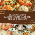 This seafood casserole is a simple, comforting dish that combines tender haddock, scallops, and shrimp in a creamy, cheesy sauce. It’s perfect for a weeknight dinner or a special occasion when you want something elegant yet easy to prepare.