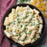 - Combine Pasta and Sauce: Add the cooked rigatoni to the pan with the sautéed shallots and peas. Pour the silken tofu sauce over the pasta and toss everything together to combine well. If the pasta looks dry, add a small amount of the reserved pasta water to achieve the desired creaminess.