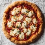 This Sourdough Pizza Crust recipe offers a flavorful and chewy base made with a fermented sourdough starter, whole wheat and all-purpose flours, and olive oil. Designed to be baked either in a cast iron skillet or on a pizza stone, it yields a crispy, slightly charred crust with a tangy depth that elevates any pizza toppings of your choice. The dough is prepared with an overnight fermentation and an optional cold ferment for enhanced flavor and texture, making it a perfect choice for homemade artisan pizza.