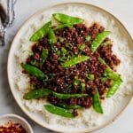 A flavorful and spicy Korean-inspired ground venison dish cooked with a sweet and savory sauce, crisp snap peas, and aromatic garlic and ginger. Perfect served over white rice for a hearty and satisfying meal.