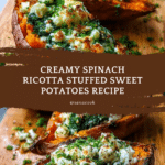 These Spinach and Ricotta Stuffed Sweet Potatoes are a delicious and nutritious vegetarian meal. Roasted until tender, the sweet potatoes are filled with a creamy mixture of sautéed spinach, ricotta cheese, Parmesan, and warm spices, then finished with a fresh herb and lemon drizzle. Perfect for a wholesome dinner or a satisfying lunch, this recipe combines comforting flavors with vibrant herbs for a delightful dish.