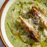 - Combine and Serve: Remove bay leaves and thyme sprigs from the soup. Stir the sautéed artichokes and spinach cashew cream into the pot until fully incorporated. Remove from heat and serve hot, drizzled with extra virgin olive oil if desired, alongside toasted sourdough bread.