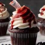 - Assemble: Using a small knife or cupcake corer, remove the centers of the cooled cupcakes and fill them with the prepared white chocolate ganache. Pipe or spread the white chocolate buttercream generously over the cupcakes. Carefully press the sugar glass shards gently into the buttercream to mimic broken glass. Finish by drizzling the edible blood over the top to create a spooky, gory effect perfect for any Halloween celebration.