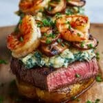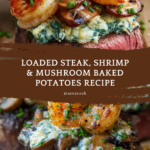 This Steak, Shrimp & Mushroom Loaded Baked Potatoes recipe combines hearty baked russet potatoes with savory seared steak, succulent shrimp, and tender mushrooms, all topped with melted cheese, creamy sour cream, and fresh green onions. It’s a perfect indulgent comfort food that is both filling and flavorful, ideal for a satisfying dinner or weekend treat.