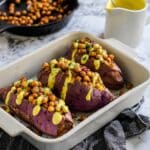 Keywords: Stuffed sweet potatoes, purple sweet potatoes, Tandoori Masala chickpeas, turmeric tahini dressing, vegan, plant-based, healthy dinner, roasted chickpeas
