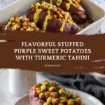 Deliciously vibrant Stuffed Purple Sweet Potatoes filled with spiced Tandoori Masala chickpeas and drizzled with a creamy turmeric tahini dressing. This wholesome and colorful recipe offers a perfect balance of earthy sweetness and bold spices, ideal for a nutritious and satisfying plant-based meal.