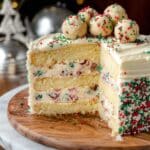 - Decorate the Cake: Frost the cake fully with remaining frosting. Top with frozen sugar cookie dough balls and sprinkle with extra Christmas sprinkles for a festive finish.