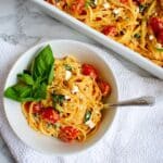 - Toss with Pasta: Add the cooked pasta to the baking dish, stirring gently to coat the pasta evenly with the creamy tomato and feta sauce.