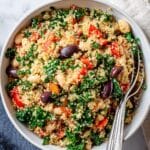 This Vegan Lemon-Garlic Mediterranean Quinoa is a versatile and vibrant dish, perfect as a warm meal or a refreshing salad. Packed with nutrient-rich ingredients like kale, white beans, olives, and fresh lemon juice, it offers a delightful balance of flavors and textures. The quinoa is cooked in savory vegetable broth for added depth, while garlic-infused olive oil adds a fragrant touch. Enjoy this healthy, gluten-free, and plant-based recipe for a fulfilling Mediterranean-inspired experience.